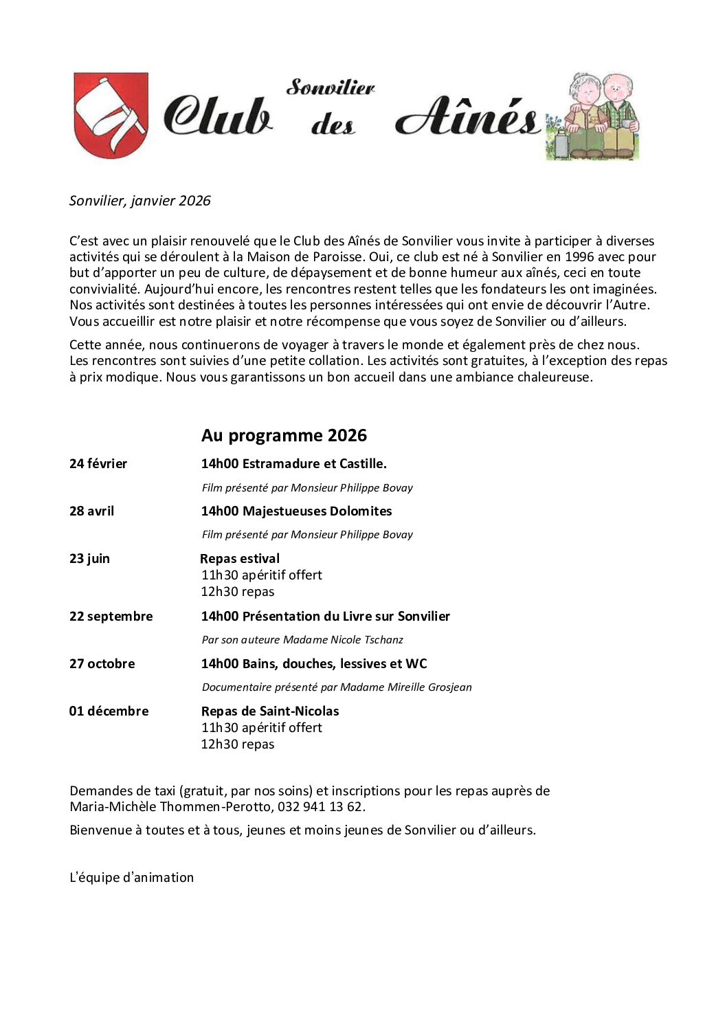Programme 2026 – Club des Aînés de Sonvilier